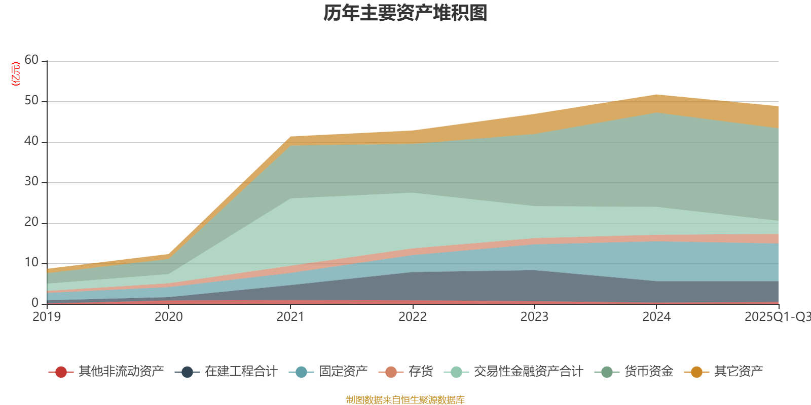 资产重大变化方面,截至2025年三季度末,公司交易性金融资产合计较上年末减少53%,占公司总资产比重下降6.69个百分点;货币资金较上年末减少1.86%,占公司总资产比重上升1.79个百分点;存货较上年末增加47.7%,占公司总资产比重上升1.75个百分点;预付款项较上年末增加171.74%,占公司总资产比重上升0.72个百分点。