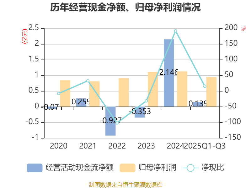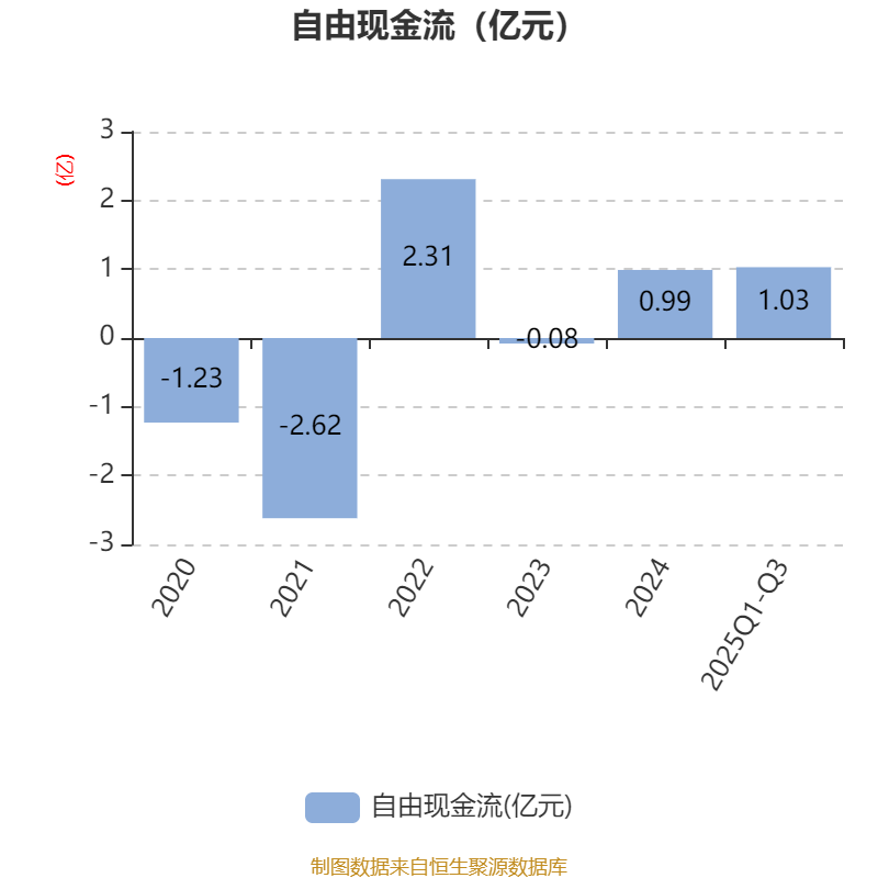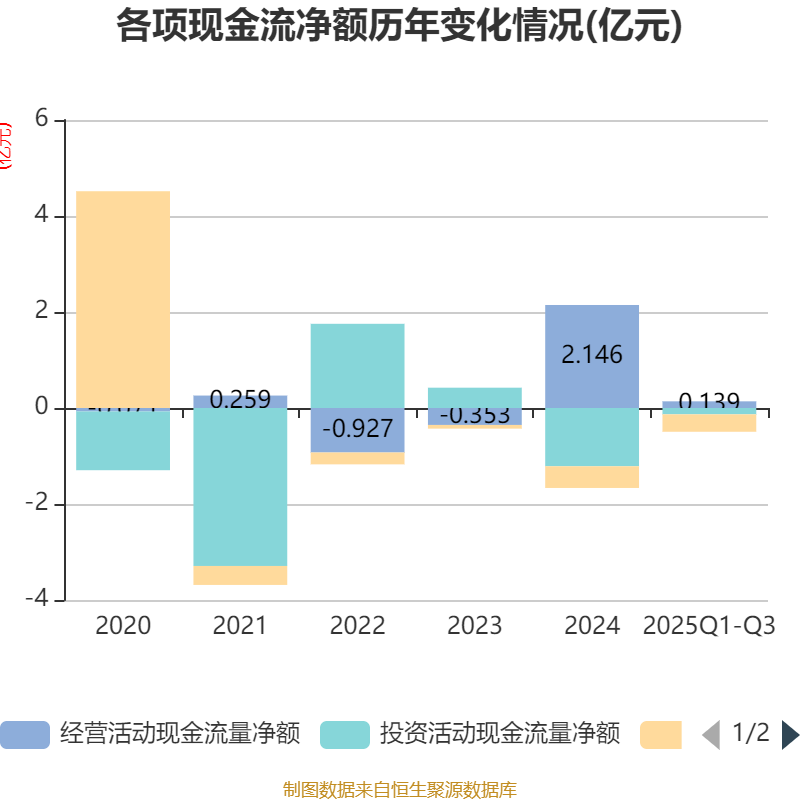 2025年前三季度,公司经营活动现金流净额为1393.17万元,同比下降45.82%;筹资活动现金流净额-3630.7万元,同比增加822.68万元;投资活动现金流净额-1323.64万元,上年同期为6380.42万元。