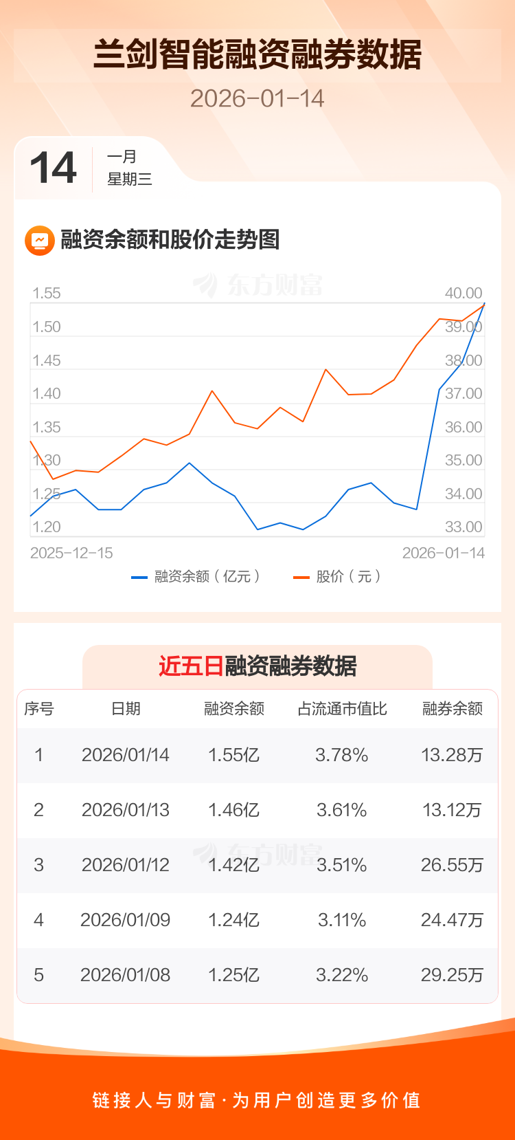 交易所最新数据显示,兰剑智能于2026年1月14日获融资买入2366.40万元,融资偿还1458.66万元,当日融资净买入907.74万元。目前,该股融资余额1.55亿,占流通市值比例为3.78%。