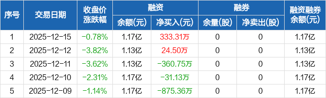 明冠新材融资融券信息显示,2025年12月15日融资净买入333.31万元;融资余额1.17亿元,较前一日增加2.94%。