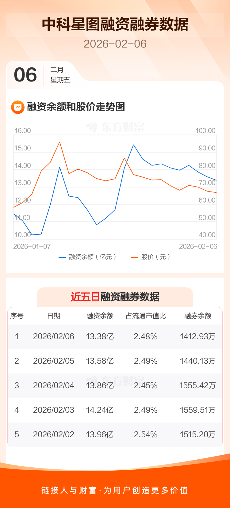 交易所最新数据显示,中科星图于2026年2月6日获融资买入7373.87万元,融资偿还9322.38万元,当日融资净偿还1948.51万元。目前,该股融资余额13.38亿,占流通市值比例为2.48%。