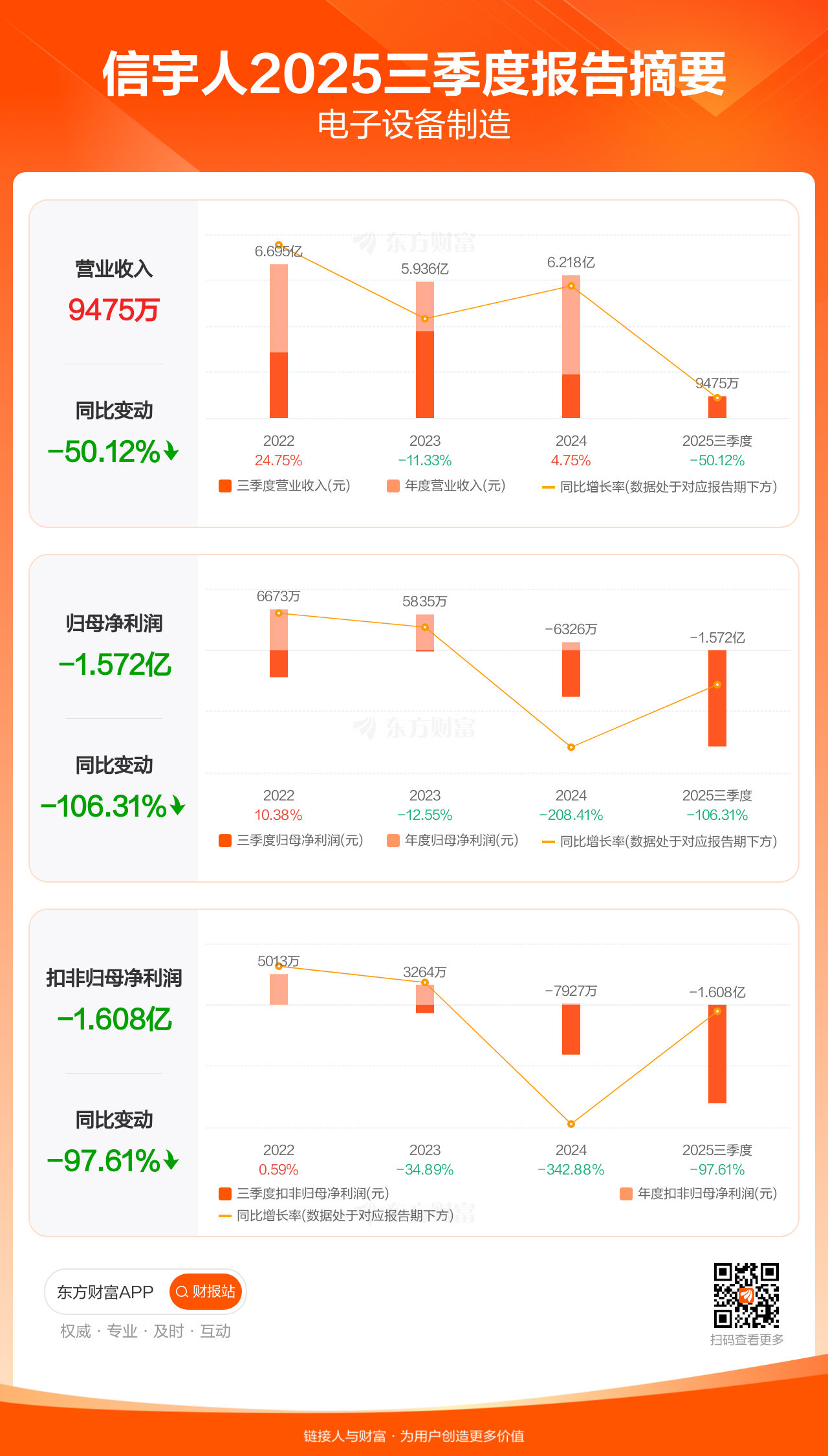 信宇人10月29日发布2025年三季报显示,公司前三季实现营业收入9475.40万元,同比下滑50.12%;归母净利润-1.57亿元;扣非归母净利润-1.61亿元。