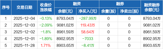 信宇人:融资净偿还287.99万元,融资余额8793.04万元(12-04)