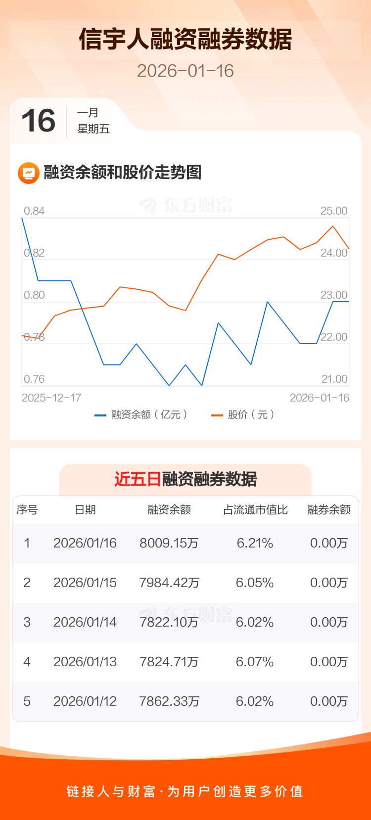 交易所最新数据显示,信宇人于2026年1月16日获融资买入751.13万元,融资偿还726.40万元,当日融资净买入24.73万元。目前,该股融资余额8009.15万,占流通市值比例为6.21%。
