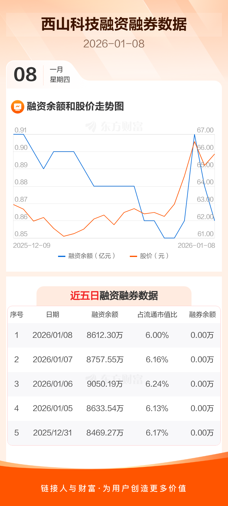 交易所最新数据显示,西山科技于2026年1月8日获融资买入387.89万元,融资偿还533.15万元,当日融资净偿还145.26万元。目前,该股融资余额8612.30万,占流通市值比例为6.00%。