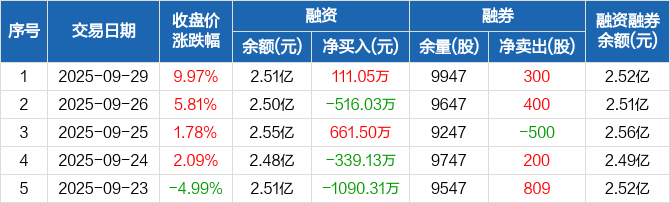 浙海德曼:融资净买入111.05万元,融资余额2.51亿元(09-29)