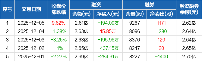 浙海德曼:融资净偿还194.09万元,融资余额2.61亿元(12-05)