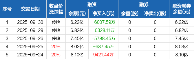 融资方面,当日融资买入0元,融资偿还6007.59万元,融资净偿还6007.59万元,连续4日净偿还累计1.88亿元。融券方面,融券卖出0股,融券偿还0股,融券余量0股,融券余额0元。融资融券余额合计6.22亿元。