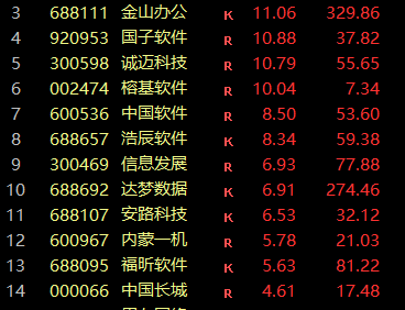 盘初,国产软件板块持续发力,中国软件一度涨停,金山办公一度涨超15%,达梦数据、中国长城、太极股份等全线上扬。