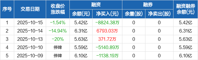 融资方面,当日融资买入1.05亿元,融资偿还1.93亿元,融资净偿还8824.38万元,净偿还额创历史新高。融券方面,融券卖出0股,融券偿还0股,融券余量0股,融券余额0元。融资融券余额合计5.42亿元。