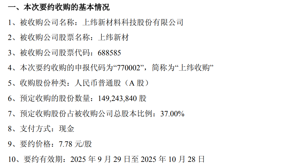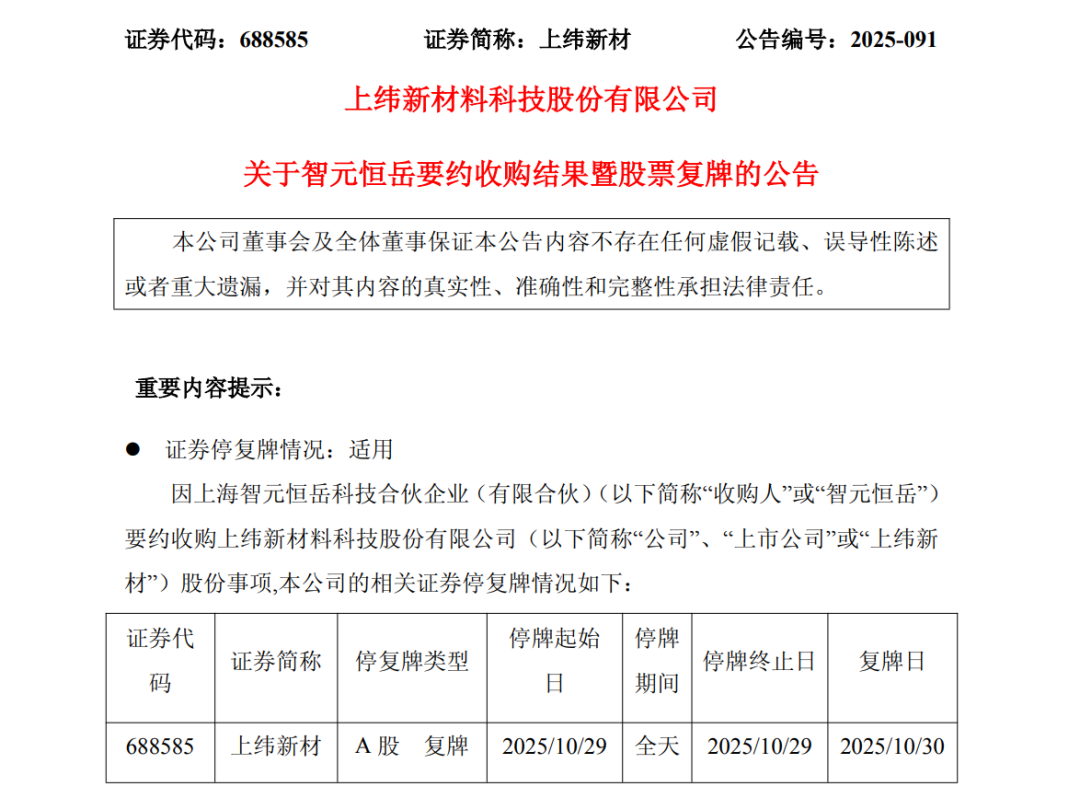 10月29日,上纬新材发布公告称,上海智元恒岳科技合伙企业(有限合伙)(以下简称智元恒岳)要约收购公司股份期限届满。