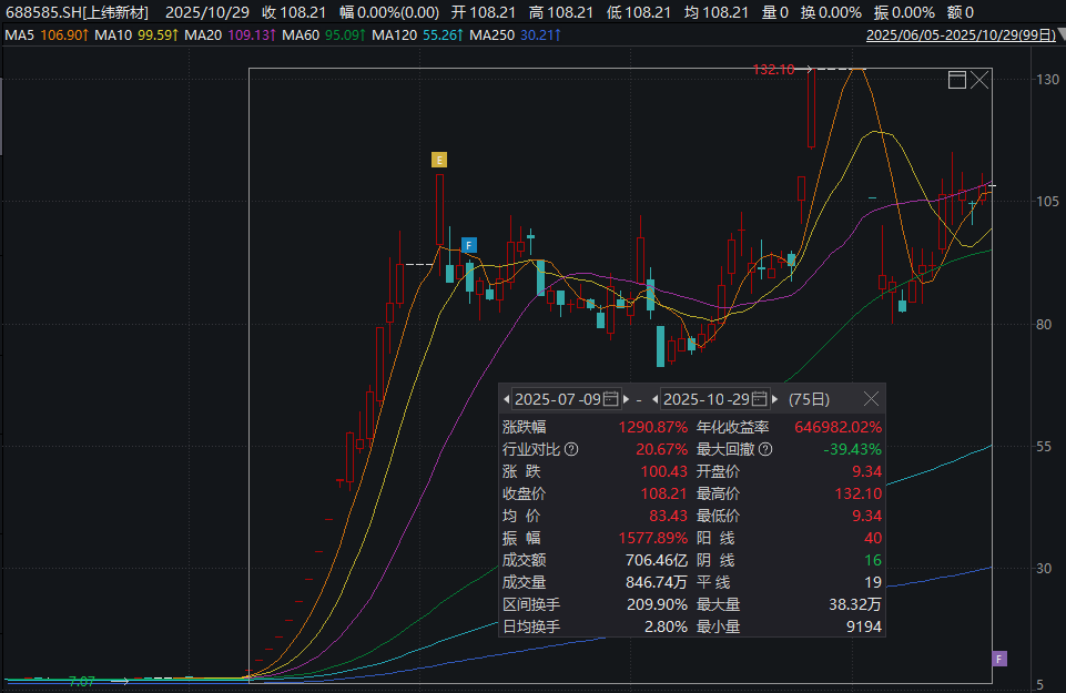 截至10月28日收盘,上纬新材股价报108.21元/股,总市值达436亿元。