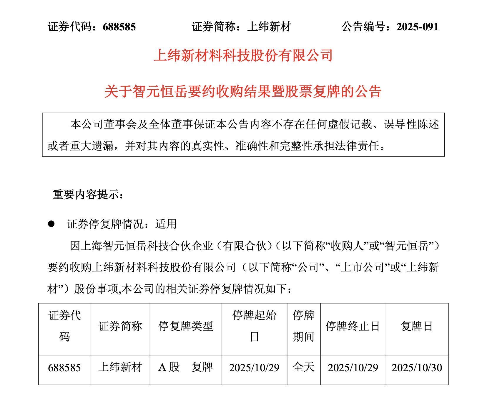 上纬新材股票自2025年10月30日(星期四)开市起复牌。