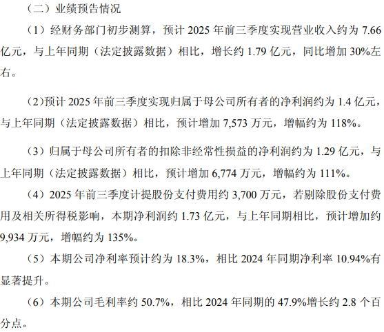 业绩预告称,公司2025年前三季度计提股份支付费用约 3,700 万元,若剔除股份支付费用及相关所得税影响,本期净利润约 1.73 亿元,与上年同期相比,预计增加约9,934 万元,增幅约为 135%。本期公司净利率预计约为 18.3%,相比 2024 年同期净利率 10.94%有显著提升。本期公司毛利率约 50.7%,相比 2024 年同期的 47.9%增长约 2.8 个百分点。