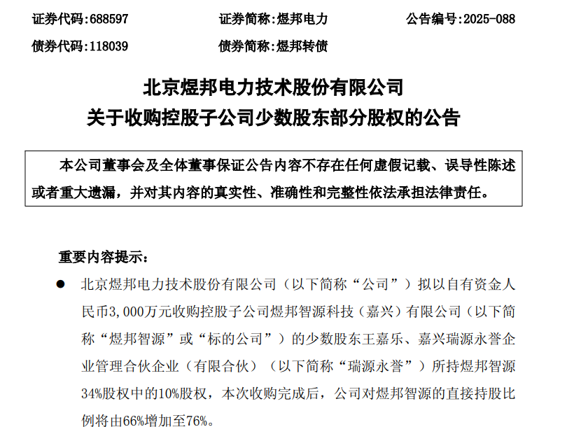 12月9日,煜邦电力(688597)发布公告,公司拟以自有资金3000万元收购控股子公司煜邦智源科技(嘉兴)有限公司(以下简称“标的公司”)10%股权,本次收购完成后,公司对标的公司的直接持股比例将由66%增加至76%。