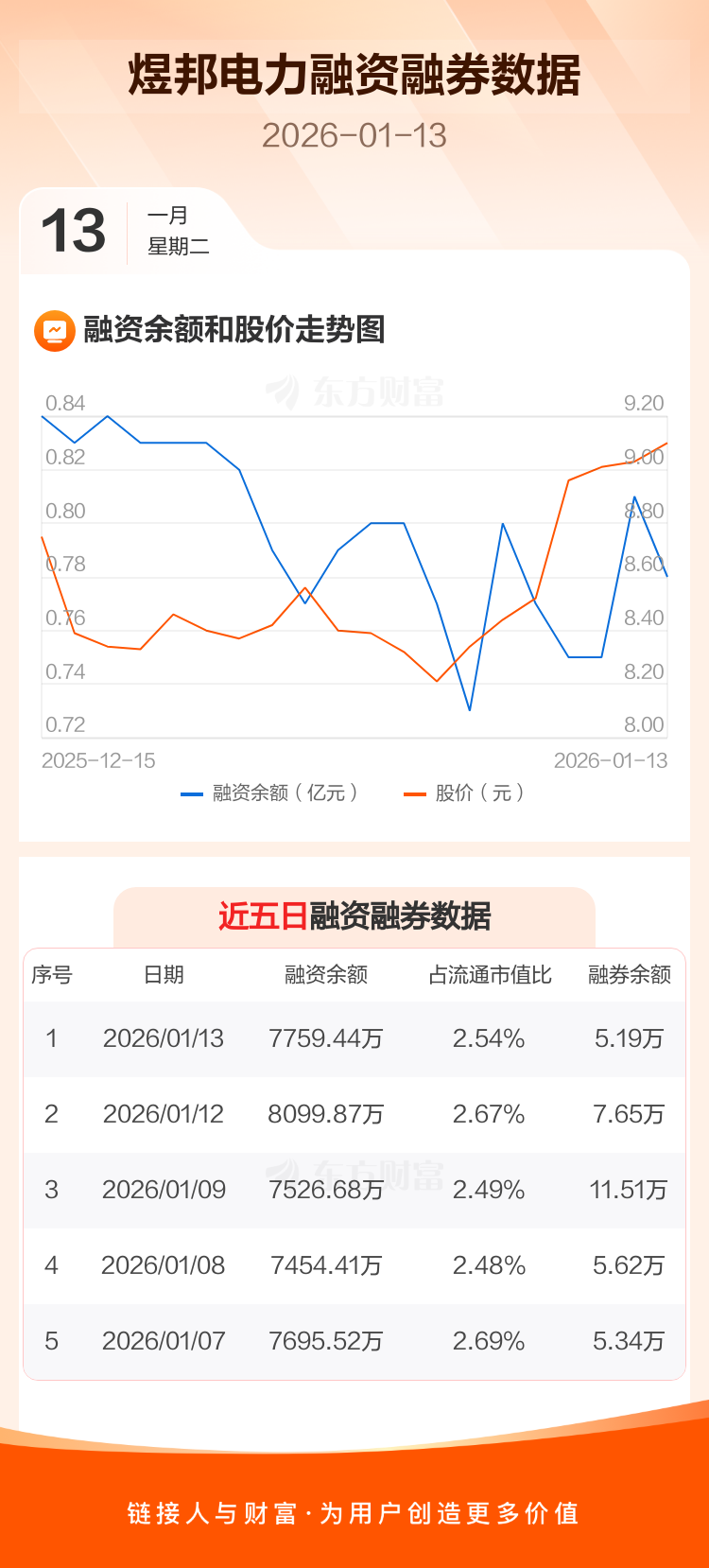 交易所最新数据显示,煜邦电力于2026年1月13日获融资买入708.02万元,融资偿还1048.44万元,当日融资净偿还340.42万元。目前,该股融资余额7759.44万,占流通市值比例为2.54%。