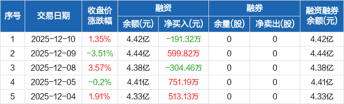 杭州柯林:融资净偿还191.32万元,融资余额4.42亿元(12-10)