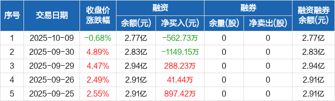呈和科技:融资净偿还562.73万元,融资余额2.77亿元(10-09)