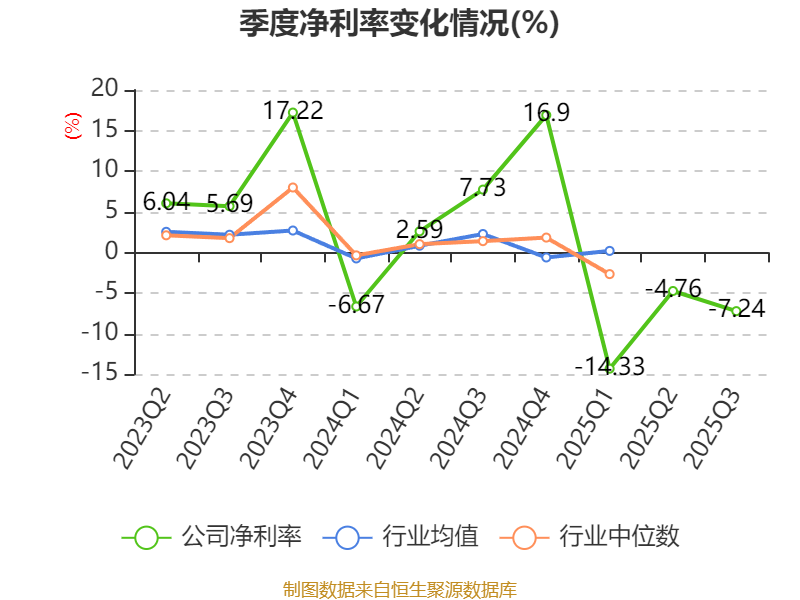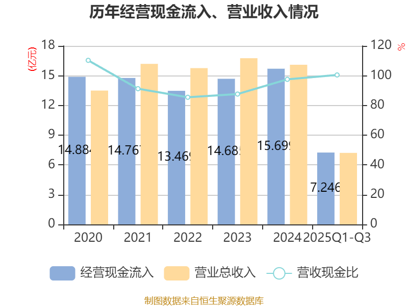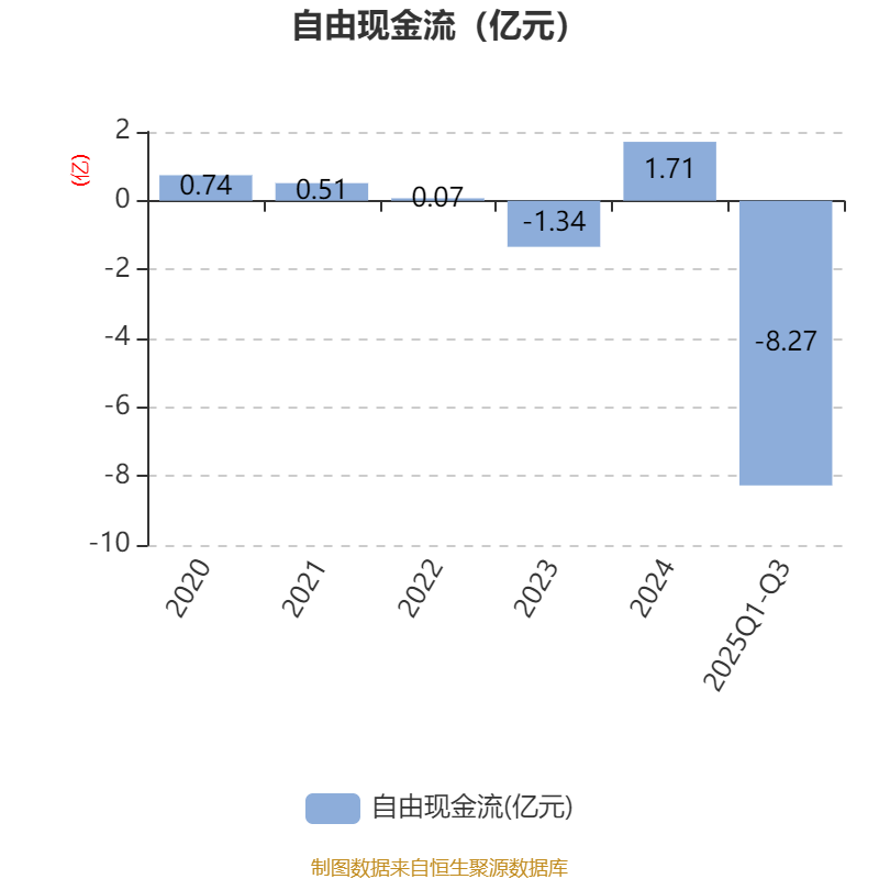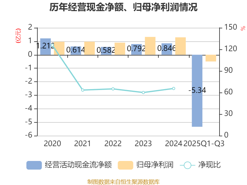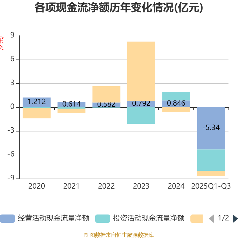 2025年前三季度,公司经营活动现金流净额为-5.34亿元,同比减少3215.94万元;筹资活动现金流净额-6584.47万元,同比增加272.86万元;投资活动现金流净额-2.7亿元,上年同期为-3.35亿元。