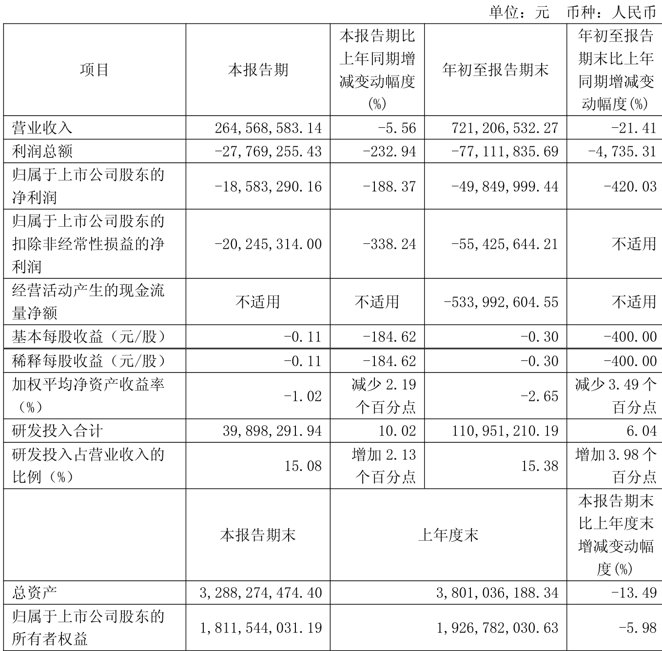中证智能财讯莱斯信息(688631)10月30日披露2025年第三季度报告。前三季度公司实现营业总收入7.21亿元,同比下降21.41%;归母净利润亏损4985万元,上年同期盈利1557.69万元;扣非净利润亏损5542.56万元,上年同期亏损442.01万元;经营活动产生的现金流量净额为-5.34亿元,上年同期为-5.02亿元;报告期内,莱斯信息基本每股收益为-0.3元,加权平均净资产收益率为-2.65%。