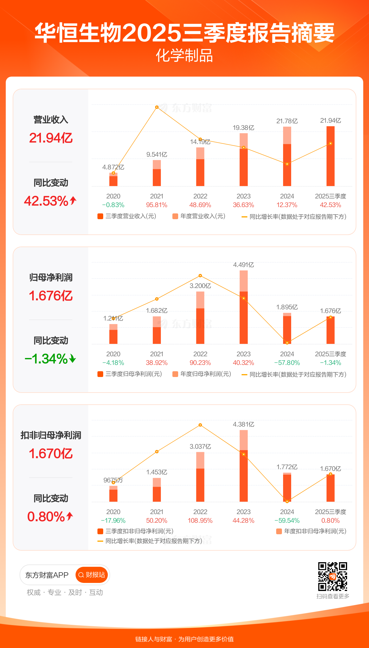 华恒生物10月28日发布2025年三季报显示,公司前三季实现营业收入21.94亿元,同比增长42.53%;归母净利润1.68亿元,同比下滑1.34%;扣非归母净利润1.67亿元,同比增长0.80%。
