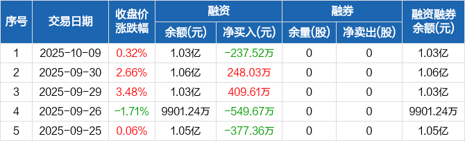 盛邦安全:融资净偿还237.52万元,融资余额1.03亿元(10-09)