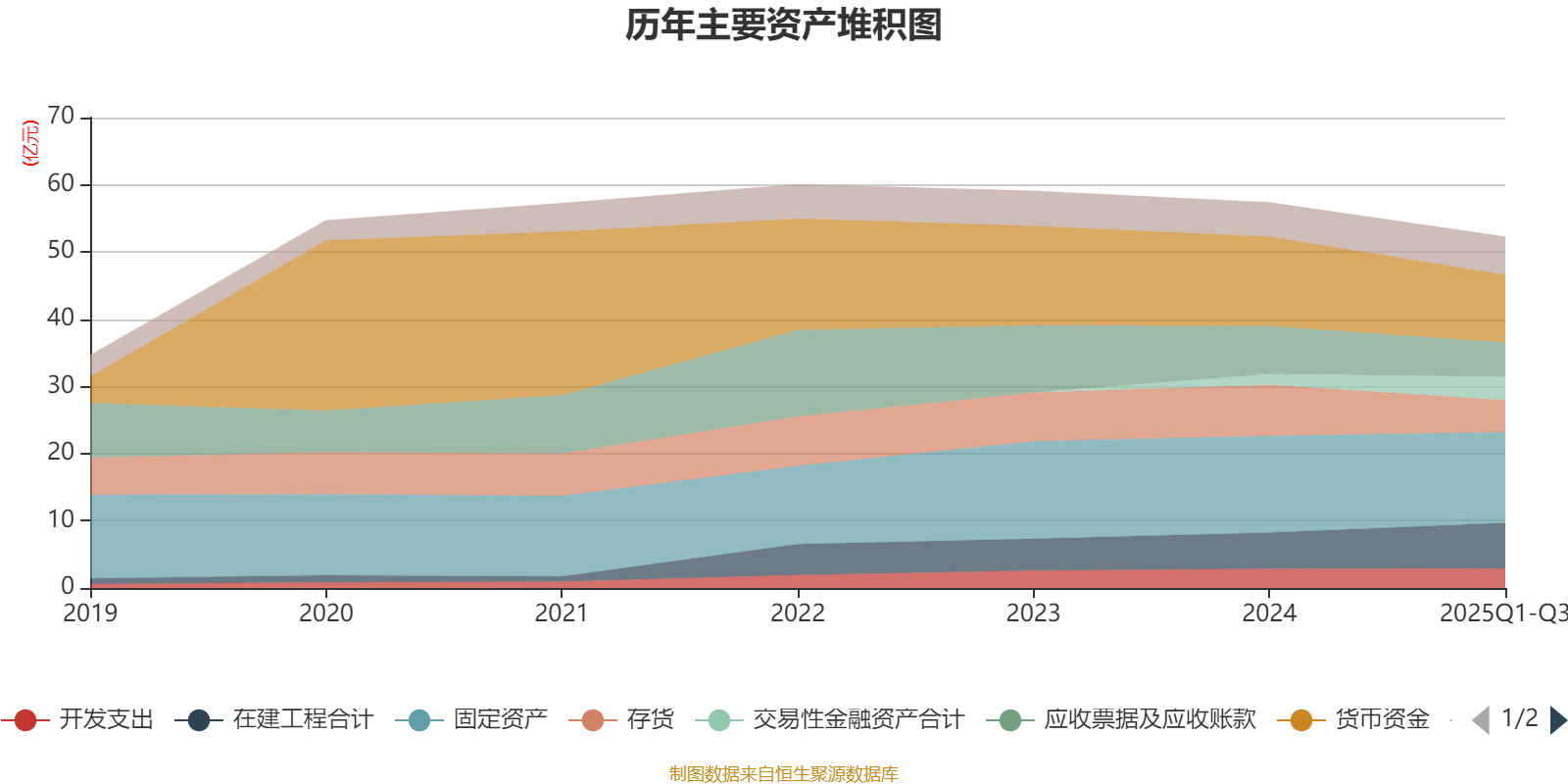 资产重大变化方面,截至2025年三季度末,公司存货较上年末减少36.98%,占公司总资产比重下降4.07个百分点;货币资金较上年末减少24.27%,占公司总资产比重下降3.92个百分点;交易性金融资产合计较上年末增加115.72%,占公司总资产比重上升3.82个百分点;在建工程合计较上年末增加25.49%,占公司总资产比重上升3.55个百分点。