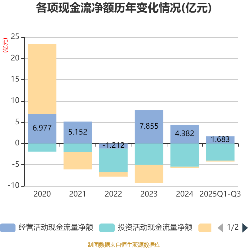 2025年前三季度,公司经营活动现金流净额为1.68亿元,同比下降60.9%;筹资活动现金流净额-2331.59万元,同比减少2006.05万元;投资活动现金流净额-4.02亿元,上年同期为-3.2亿元。