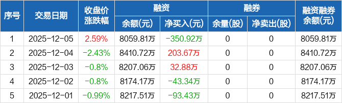 元琛科技:融资净偿还350.92万元,融资余额8059.81万元(12-05)