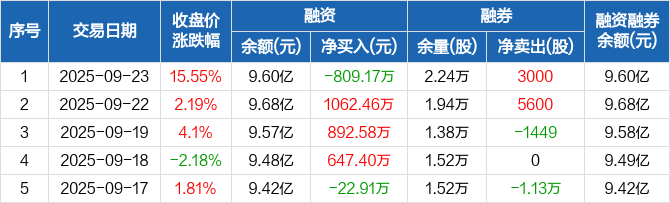 电气风电:融资净偿还809.17万元,融资余额9.6亿元(09-23)