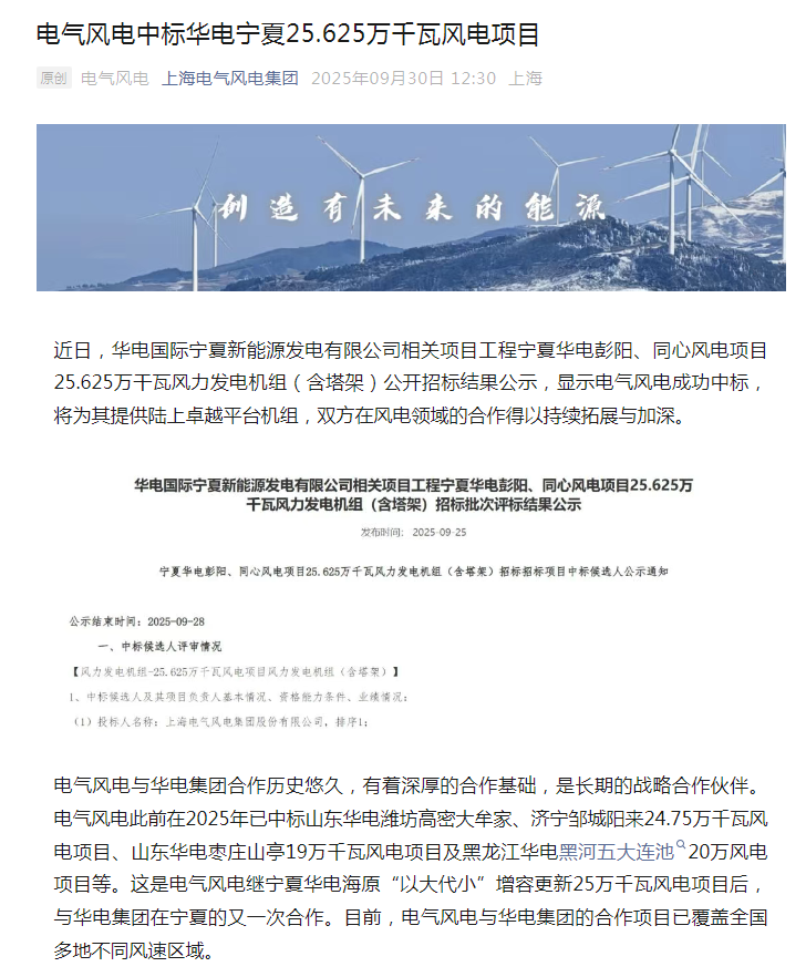 电气风电中标华电宁夏25.625万千瓦风电项目