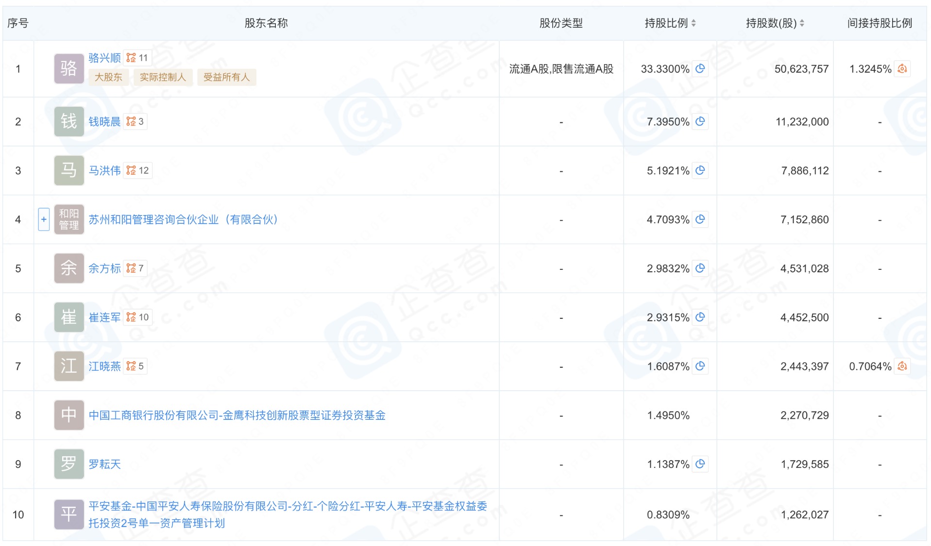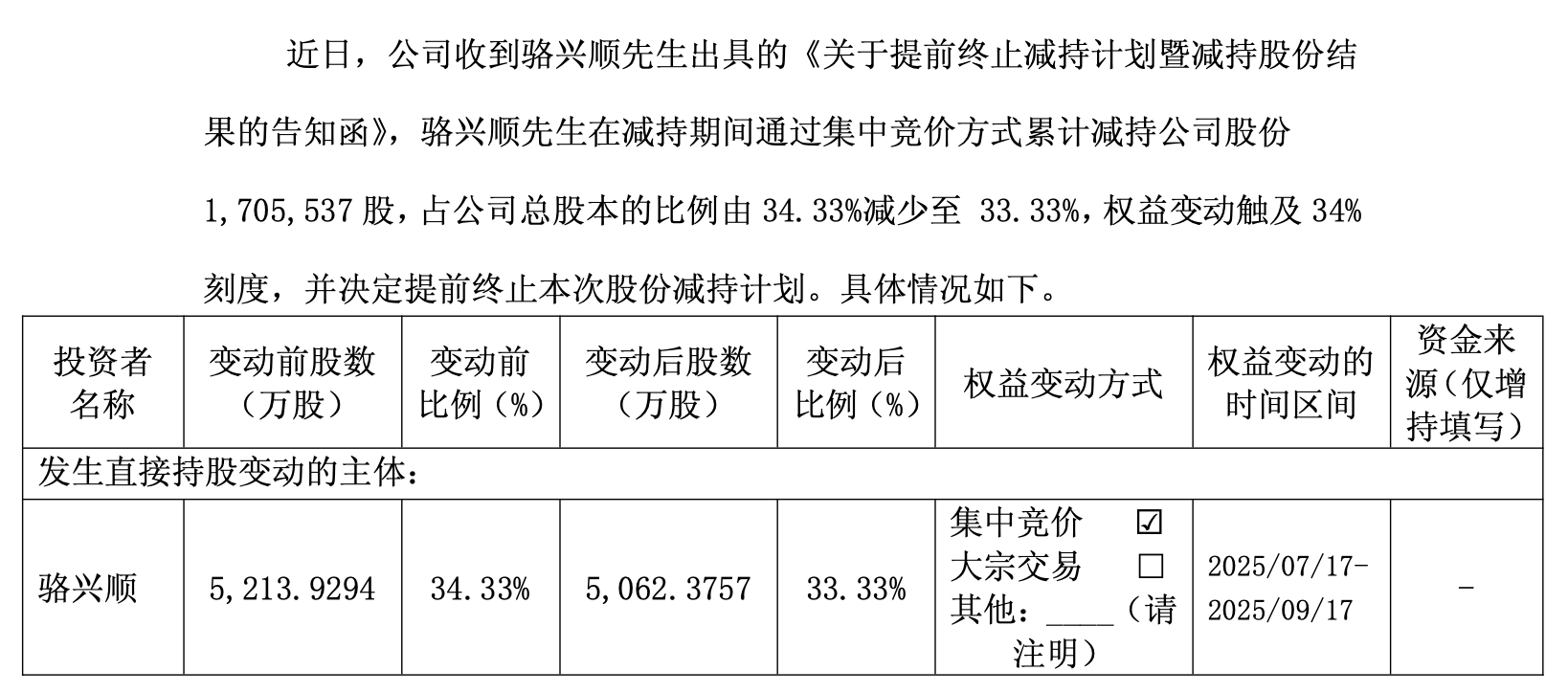 2025年6月5日,公司实控人、第一大股东骆兴顺发布减持计划:因个人资金需求,拟在6月27日至9月26日期间,减持不超过175.26万股,不超过总股本1.50%。9月20日,公告称骆兴顺已通过集中竞价累计减持170.5537万股,持股比例由34.33%降至33.33%,并提前终止本次减持计划。