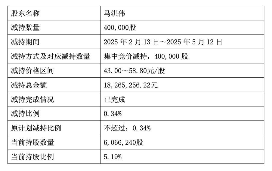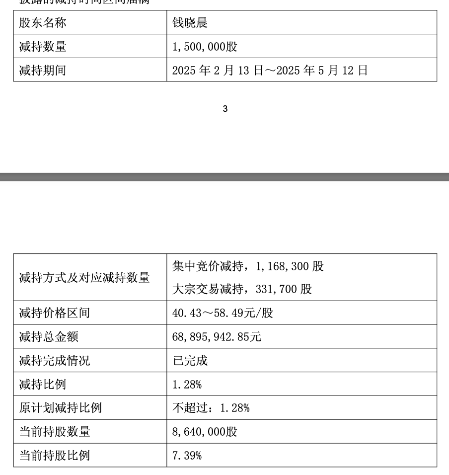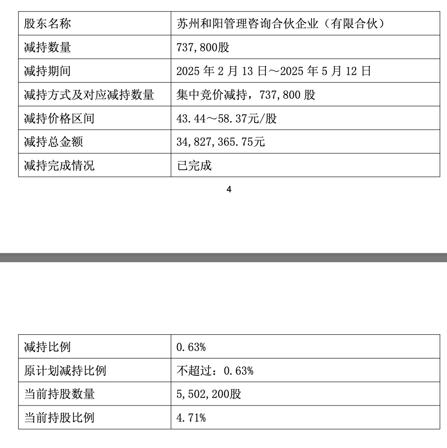 2025年5月,公司发布股东及董监高减持股份的公告,2025年2月13日至5月12日期间,钱晓晨通过集中竞价和大宗交易的方式减持150万股,占比1.28%,减持后持股比例为7.39%。马洪伟通过集中竞价减持的方式减持40万股,占比0.34%,减持后持股5.19%。苏州和阳通过集中竞价减持73.78万股,占比0.63%,减持后持股4.71%。