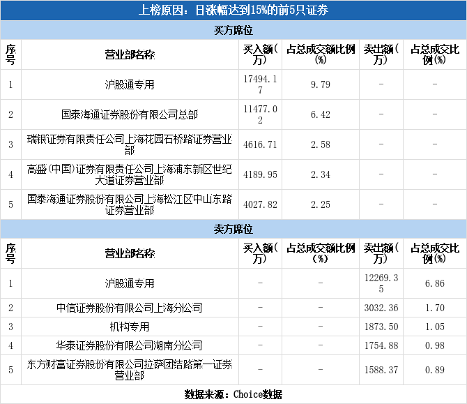 上交所2025年12月22日交易公开信息显示,鼎通科技因属于日涨幅达到15%的前5只证券而登上龙虎榜。鼎通科技当日报收118.92元,涨跌幅为20.00%,换手率11.48%,振幅19.29%,成交额17.88亿元。