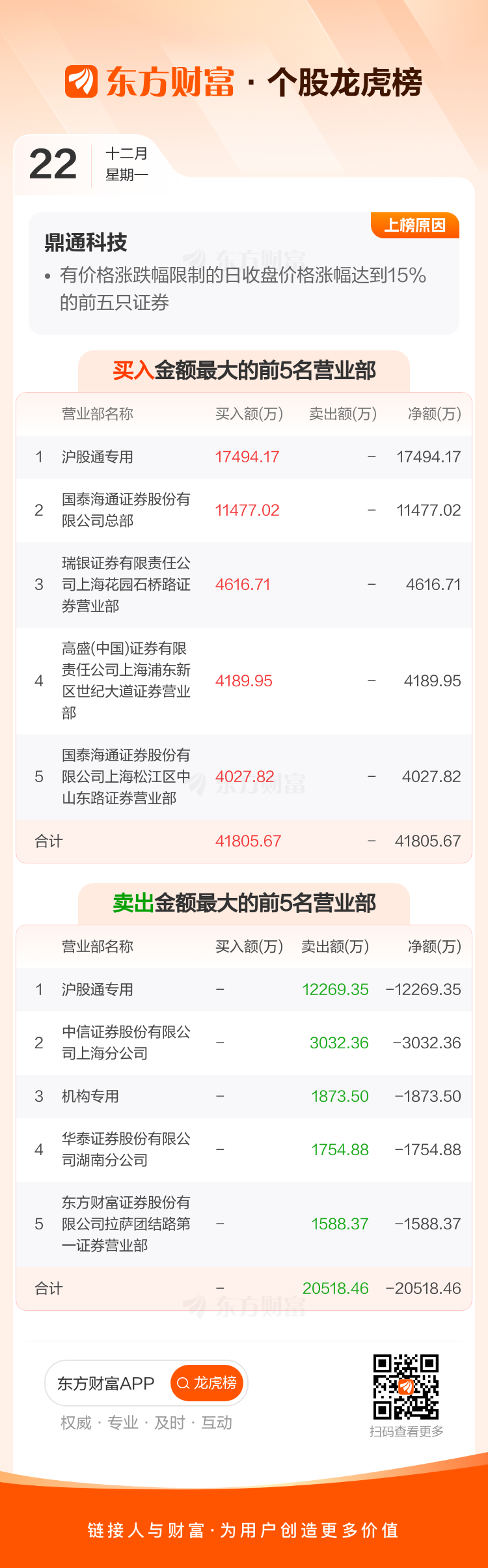 交易所2025年12月22日公布的交易公开信息显示,鼎通科技因成为有价格涨跌幅限制的日收盘价格涨幅达到15%的前五只证券上榜。鼎通科技当日收报118.92元,涨跌幅20.00%,偏离值20.00%,换手率11.48%,成交额17.88亿。