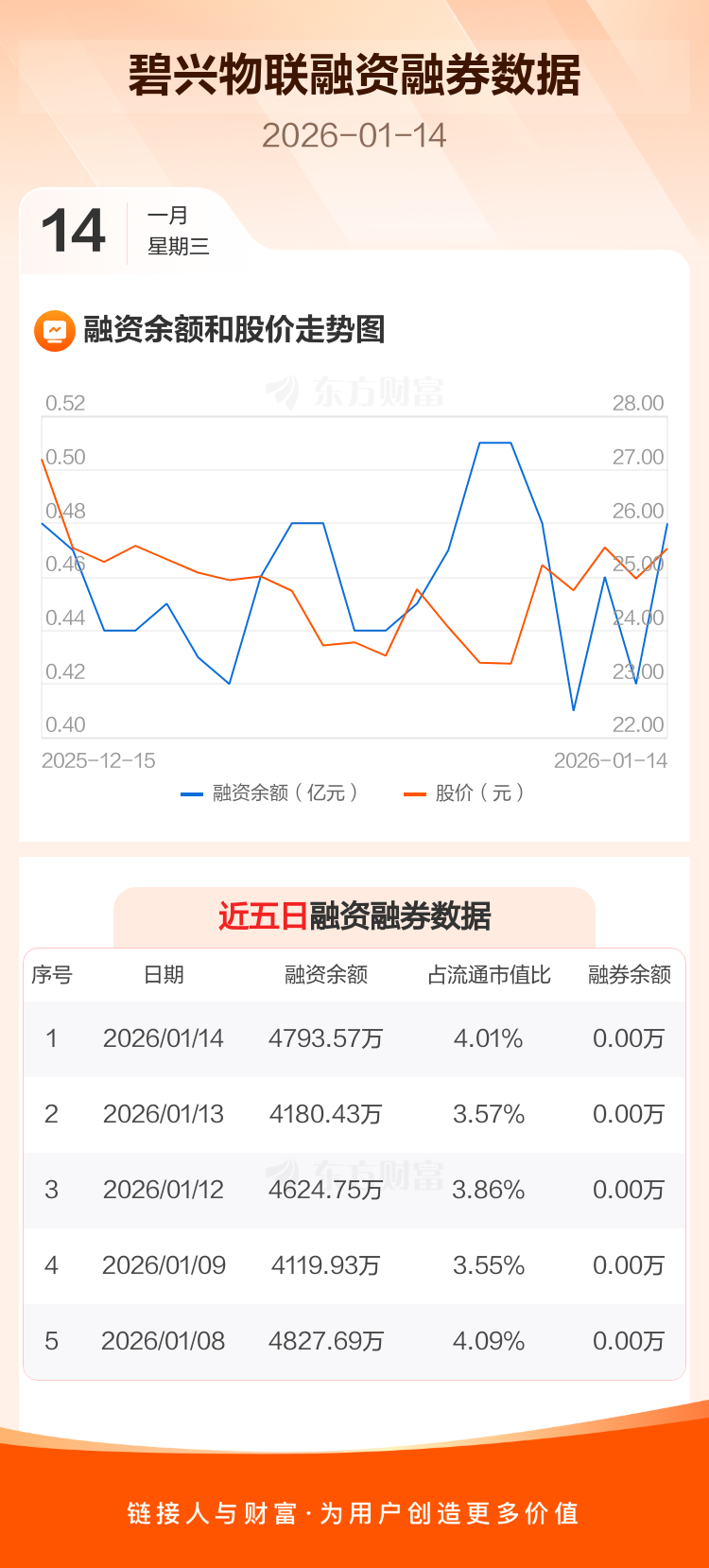 交易所最新数据显示,碧兴物联于2026年1月14日获融资买入1251.21万元,融资偿还638.07万元,当日融资净买入613.14万元。目前,该股融资余额4793.57万,占流通市值比例为4.01%。