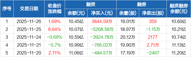 金盘科技融资融券信息显示,2025年11月26日融资净买入3844.59万元;融资余额10.45亿元,较前一日增加3.82%。