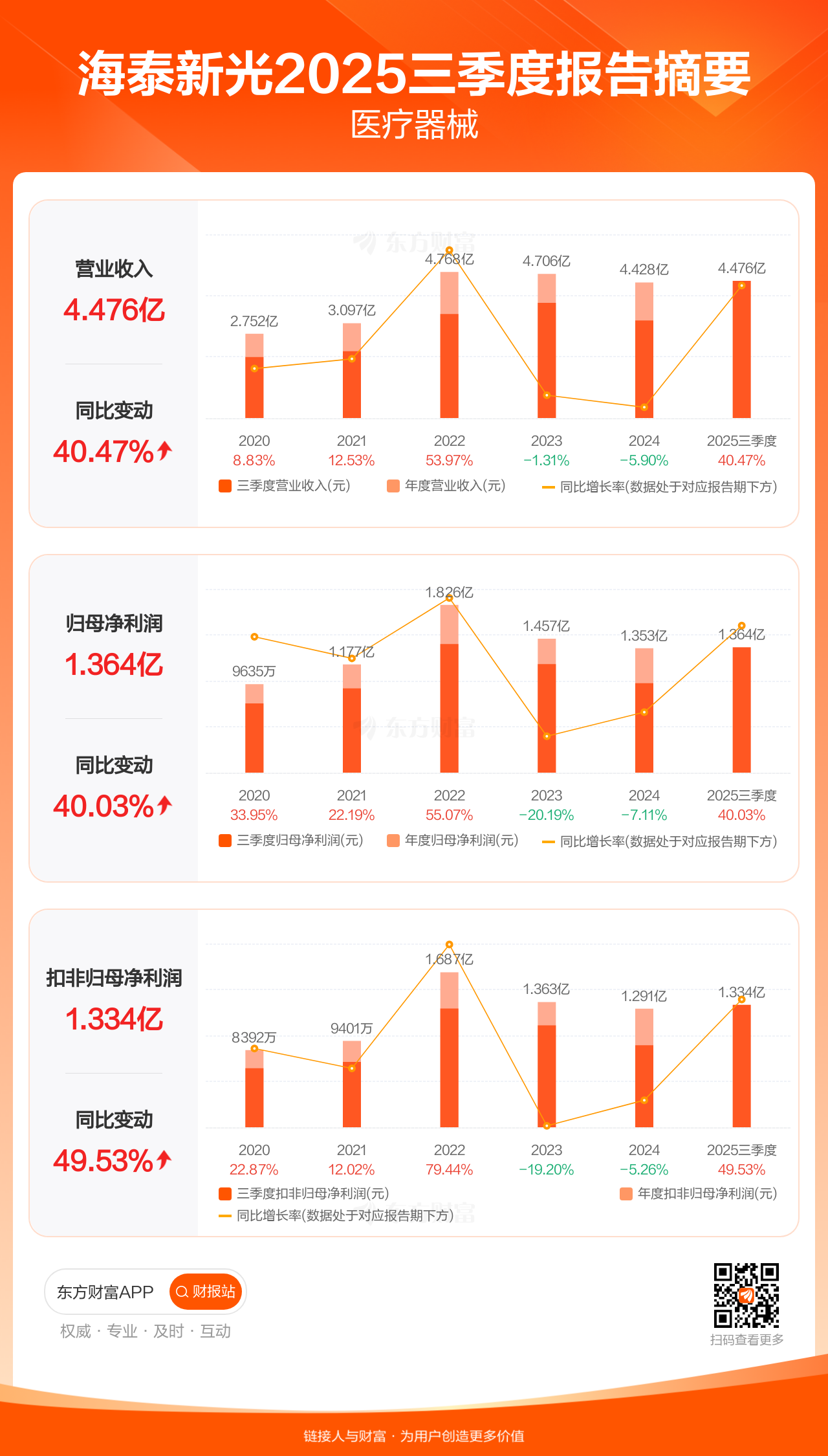 海泰新光10月25日发布2025年三季报显示,公司前三季实现营业收入4.48亿元,同比增长40.47%;归母净利润1.36亿元,同比增长40.03%;扣非归母净利润1.33亿元,同比增长49.53%。