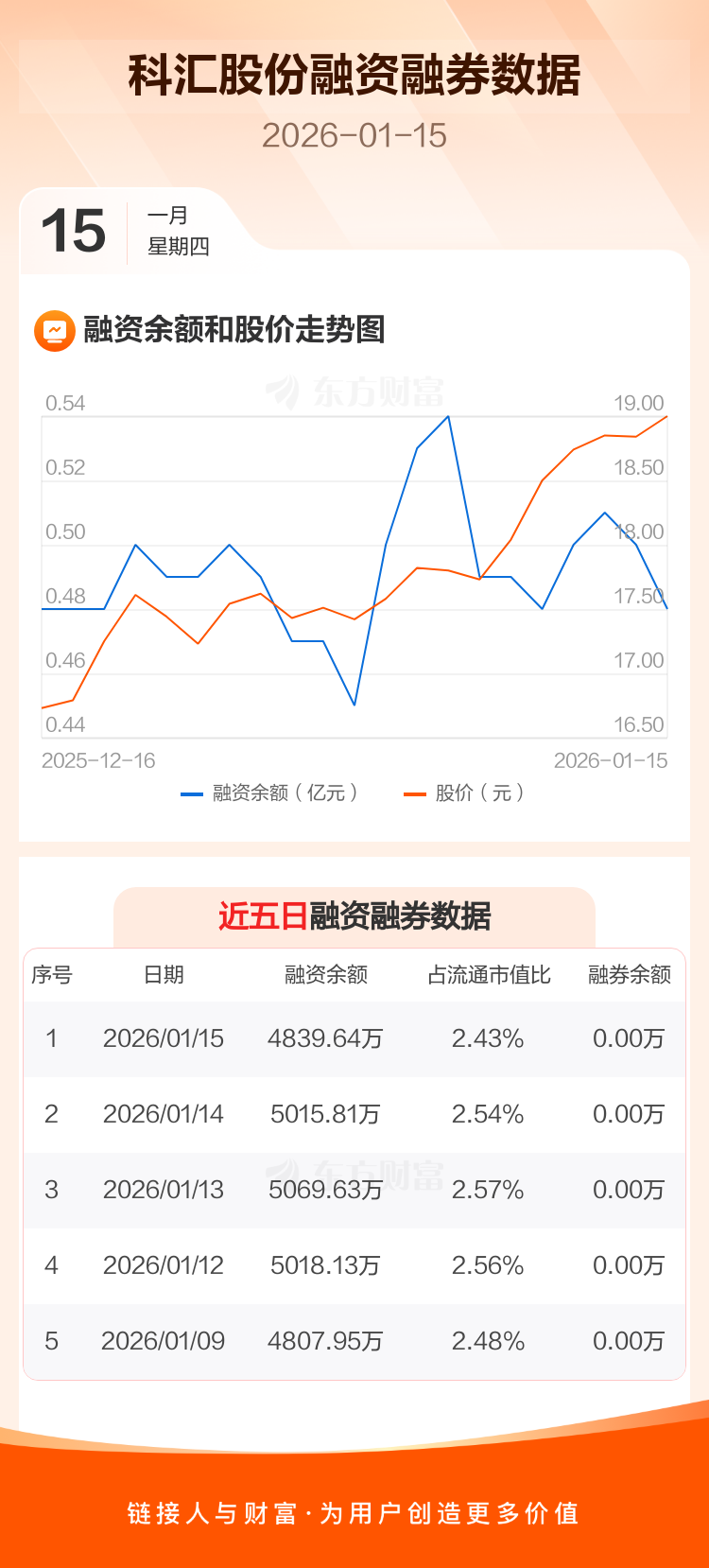 交易所最新数据显示,科汇股份于2026年1月15日获融资买入213.91万元,融资偿还390.08万元,当日融资净偿还176.17万元。目前,该股融资余额4839.64万,占流通市值比例为2.43%。