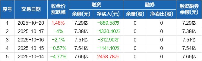 融资方面,当日融资买入2133.12万元,融资偿还3022.7万元,融资净偿还889.58万元,连续4日净偿还累计3673.98万元。融券方面,融券卖出0股,融券偿还0股,融券余量0股,融券余额0元。融资融券余额合计7.29亿元。