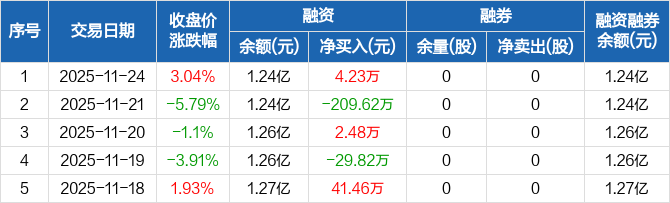 融资方面,当日融资买入176.09万元,融资偿还171.86万元,融资净买入4.23万元。融券方面,融券卖出0股,融券偿还0股,融券余量0股,融券余额0元。融资融券余额合计1.24亿元。