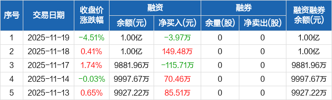 中创股份:融资净偿还3.97万元,融资余额1亿元(11-19)