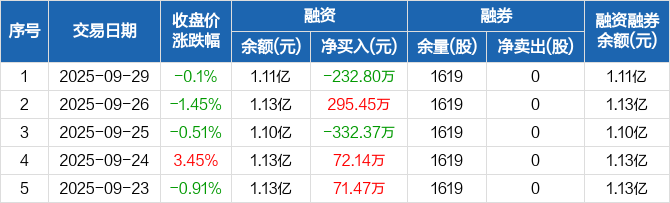 明微电子:融资净偿还232.8万元,融资余额1.11亿元(09-29)