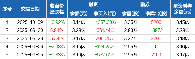 振华新材:融资净偿还1357.3万元,融资余额3.14亿元(10-09)