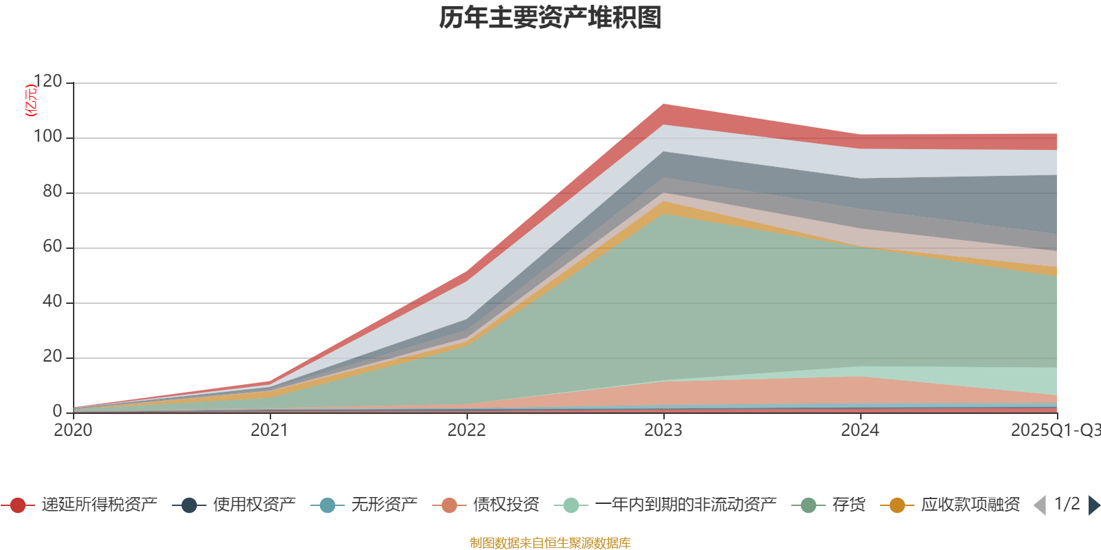资产重大变化方面,截至2025年三季度末,公司应收票据及应收账款较上年末增加94.18%,占公司总资产比重上升10.22个百分点;存货较上年末减少23.5%,占公司总资产比重下降10.17个百分点;债权投资较上年末减少71.16%,占公司总资产比重下降6.86个百分点;一年内到期的非流动资产较上年末增加173.19%,占公司总资产比重上升6.27个百分点。