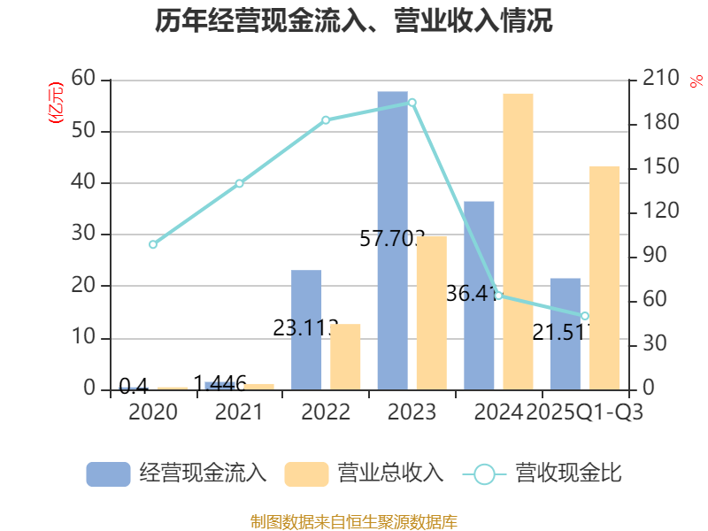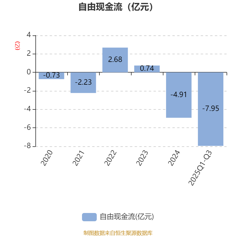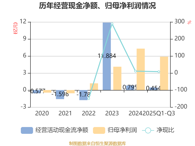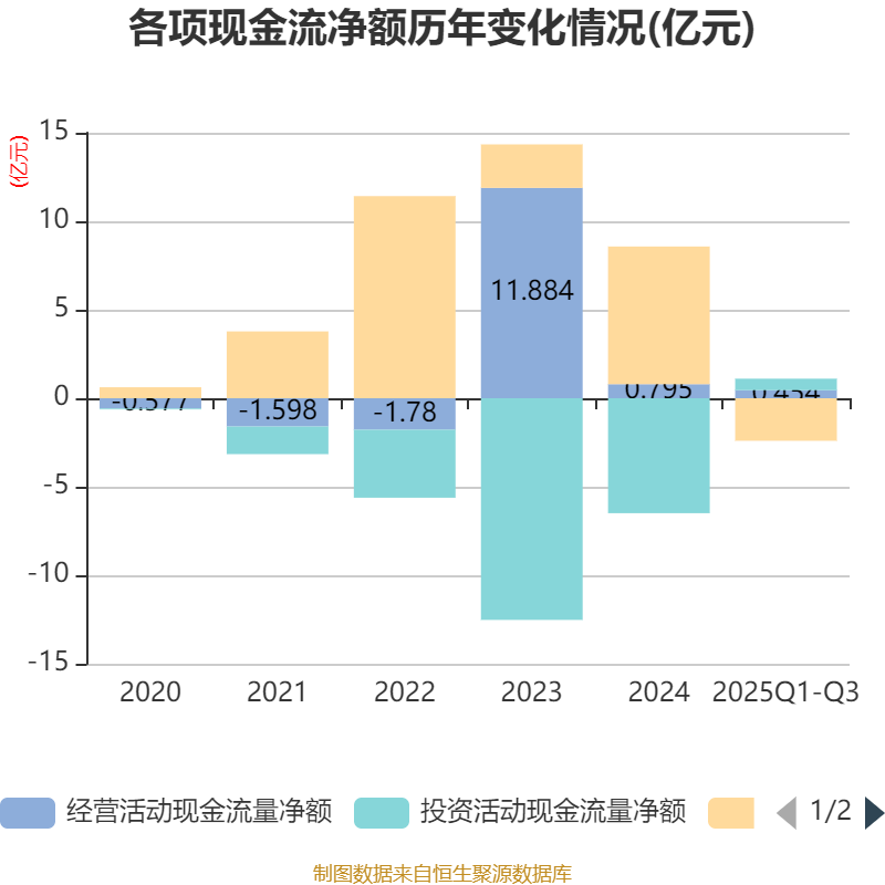 2025年前三季度,公司经营活动现金流净额为4541.11万元,同比增加1.4亿元;筹资活动现金流净额-2.4亿元,同比减少3.23亿元;投资活动现金流净额6519.42万元,上年同期为-2.77亿元。