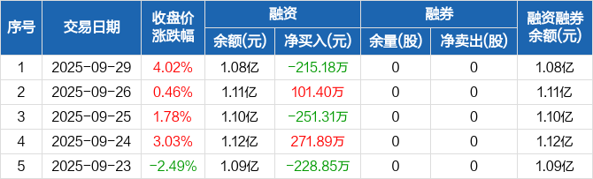 中自科技:融资净偿还215.18万元,融资余额1.08亿元(09-29)
