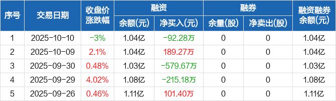中自科技:融资净偿还92.28万元,融资余额1.04亿元(10-10)