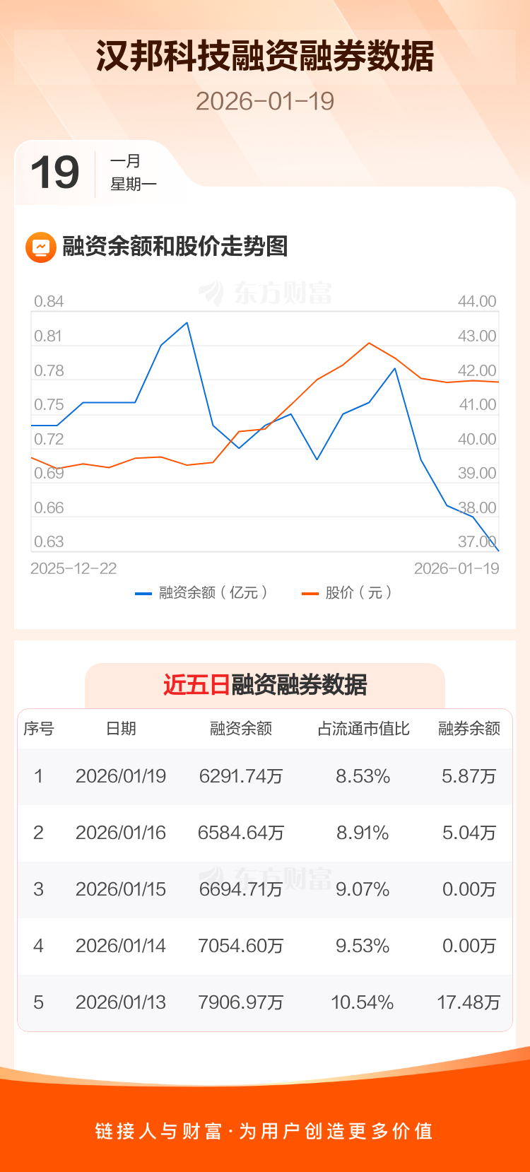 交易所最新数据显示,汉邦科技于2026年1月19日获融资买入152.72万元,融资偿还445.62万元,当日融资净偿还292.9万元。目前,该股融资余额6291.74万,占流通市值比例为8.53%。