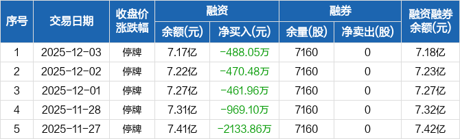 融资方面,当日融资买入0元,融资偿还488.05万元,融资净偿还488.05万元,连续10日净偿还累计3.48亿元。融券方面,融券卖出0股,融券偿还0股,融券余量7160股,融券余额89.13万元。融资融券余额合计7.18亿元。